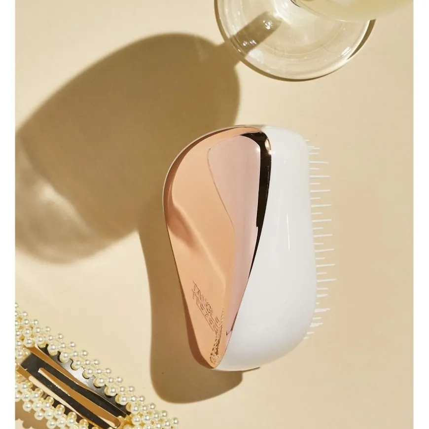 Der Tangle Teezer Rose Gold Cream Compact Styler entwirrt und entknotet nasses und trockenes Haar, ohne dabei an den Haaren zu reißen und zu ziepen. Der Styler besitzt unterschiedlich lange Kunststoffborsten, die sanft durch die Haare gleiten und die äußere Haarschicht nicht beschädigen. Hierdurch wird vermieden, dass Spliss und Haarbruch entstehen, und die Haare erhalten einen wunderschönen gesunden Glanz. Zugleich verläuft das Haarekämmen schmerzfrei und Knoten und Verfilzungen werden mühelos gelöst.Der Tangle Teezer Rose Gold Cream Compact Styler eignet sich für alle Haarstrukturen und entwirrt auch dickes und lockiges Haar. Beim Kämmen massieren die Borsten sanft die Kopfhaut und regen die Durchblutung an, sodass die Haare kräftig und gesund nachwachsen. Durch ihre ergonomische Form liegt die Bürste gut in der Hand und findet aufgrund ihrer kompakten Größe in jeder Handtasche Platz. Durch die Farbkombination von goldschimmerndem Rosa und Cremeweiß sieht der Styler elegant und zeitlos schick aus.