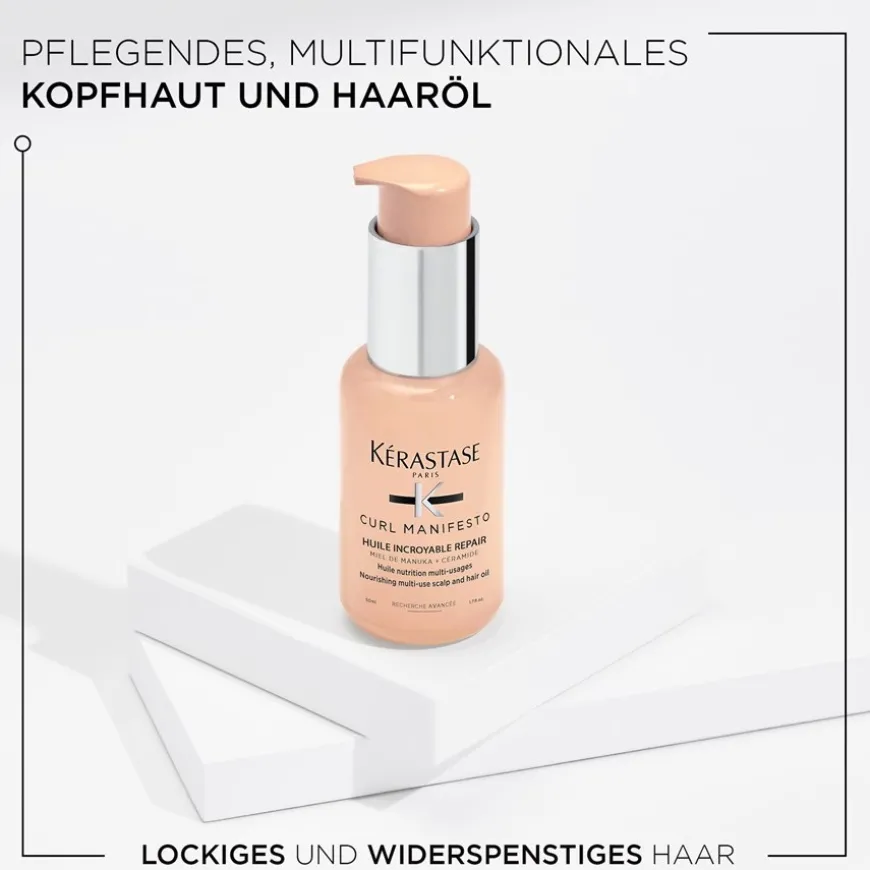Curl Manifesto Huile Sublime Repair von Kérastase durchfeuchtet die Haare und sorgt für eine gesunde, entspannte Kopfhaut. Das Haaröl wirkt Frizz und Haarbruch entgegen. Es stärkt die Haare, nährt sie und bringt sie zum Glänzen. Seine Formel eignet sich vor allem für trockene, geschädigte, stumpfe und kraftlose Locken. Tragen Sie das Öl auf die trockenen Haare und auf die Kopfhaut auf und arbeiten es bis in die Spitzen ein. Es wird nicht ausgespült. Freuen Sie sich über lebendige, schwungvolle und seidige Locken mit wunderschönem Glanz!