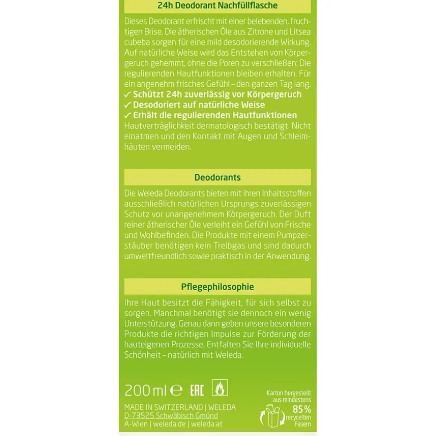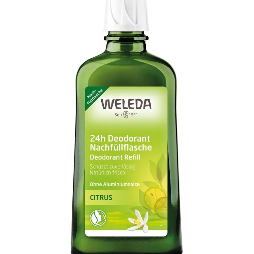 Wer Zitronen mag, wird das Citrus 24h Deodorant Spray von Weleda lieben! Unverkennbar verströmt es den fruchtig-frischen und zugleich etwas herben Duft frischer Zitronen. Ein weiterer Vorteil des Deodorants ist, dass es die Poren nicht verschließt und somit die natürlichen Ausscheidungsprozesse über die Haut nicht gestört werden. Selbstverständlich wurden die Wirksamkeit und die Hautverträglichkeit dieses Deos dermatologisch getestet und bestätigt. Können Sie gar nicht genug von diesem erfrischenden Dufterlebnis bekommen, erhalten Sie übrigens in unserem Shop auch Nachfüller für Ihren Pumpzerstäuber.