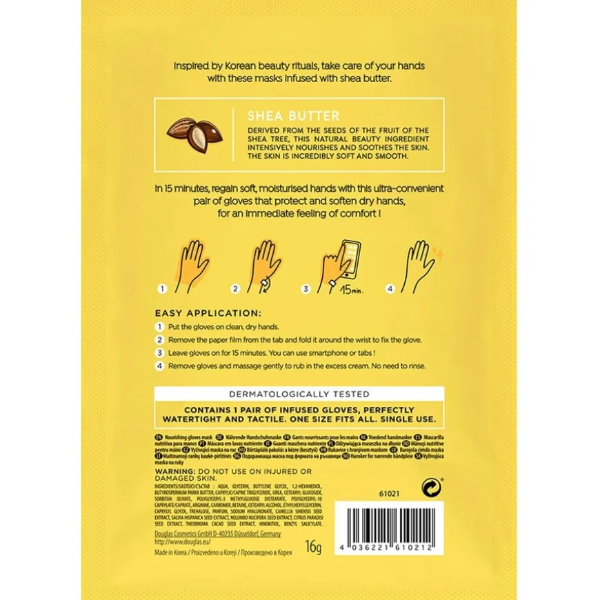 Wie auch bei seinen Gesichtspflege-Produkten hat Douglas Collection viel Wert darauf gelegt, dass sich die Nourishing Gloves leicht anwenden lassen und so auch für Anfänger hervorragend geeignet ist. Waschen Sie zunächst Ihre Hände, trocknen Sie diese gründlich ab und ziehen Sie anschließend die Handschuhe darüber. Nun können Sie die Papierfolie von der Lasche entfernen und diese so um das Handgelenk falten, dass die Pflege-Handschuhe sicher sitzen. Tragen Sie diese für mindestens 15 Minuten. Anschließend ziehen Sie diese einfach wieder ab und massieren überschüssige Creme ein. Gerne können Sie die Handschuhe mit Gesichtspflege-Produkten von Douglas Collection kombinieren und so auch Ihrer Gesichtshaut etwas Gutes tun.