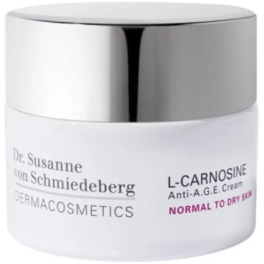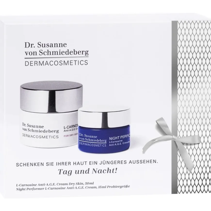 Die L-Carnosine Anti-A.G.E. Cream for dry skin richtet sich auch an Menschen mit trockener Gesichtshaut. Die Gesichtscreme Night Performer L-Carnosine Anti-A.G.E. Cream wirkt laut dem Hersteller der Faltenbildung effektiv entgegen. Das Produkt verlangsamt die Zellverzuckerung. Dafür sorgt auch der Wirkstoff der Creme, L-Carnosine. Dieser reduziert die Advanced Glycation Endproducts (A.G.E) im Körper, welche für die Verzuckerung verantwortlich sind. Dies führt laut Angaben der Marke Dr. Susanne von Schmiedeberg zu einer Verlangsamung der Hautalterung. Auch die zweite Gesichtscreme im Geschenkset enthält diese L-Carnosine. Weitere Wirkstoffe sind Lactil und Resistem. Die Creme versorgt die Haut mit Feuchtigkeit. Abends nach der Reinigung die Nachtcreme auf das Gesicht auftragen. Die Gesichtscreme dagegen kann sowohl morgens als auch abends aufgetragen werden.
