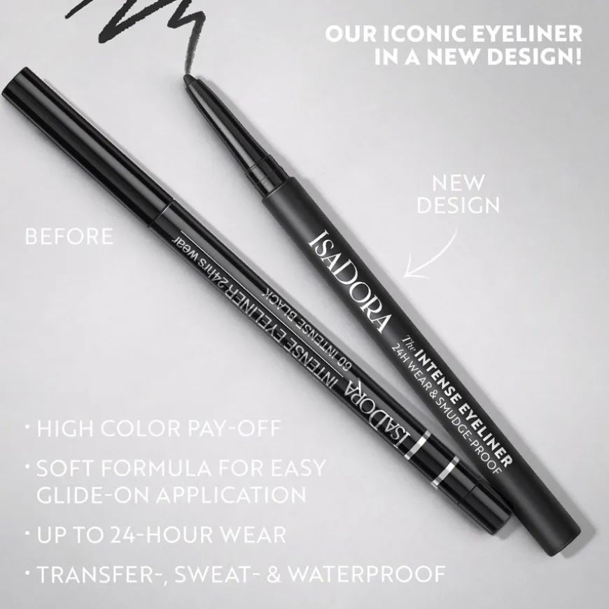 Der Eyeliner & Kajal weist eine ausgezeichnet pigmentierte Formulierung auf und ist von angenehm geschmeidiger und sanfter, aber nicht zu weicher Konsistenz. Das gestattet das Auftragen in nur einem Zug. Mit bis zu 24 Stunden verspricht The Intense Eyeliner 24H Wear & Smudge-Proof von Isadora eine lange Haltbarkeit – das betonende Make-up der Augen widersteht Abrieb, Schweiß und Feuchtigkeit. In der Praxis bedeutet das, morgens angewandt, strahlende Augen für den ganzen Tag, und auch abends behalten sie ihre Schönheit.Ausgesuchte Nuancen in natürlichen Tönen unterstreichen die Augenfarbe oder akzentuieren sie in harmonischem Kontrast. Je nach Anwendung wirkt das Erscheinungsbild geschmackvoll dezent oder als auffälliger Hingucker: Ein gelungener Wimpern- und Lidstrich entsteht in nur einem Zug, das Definieren von Konturen erfolgt ebenso leicht. Mit einem handelsüblichen Spitzer bleibt der Eyeliner & Kajal stets einsatzbereit.