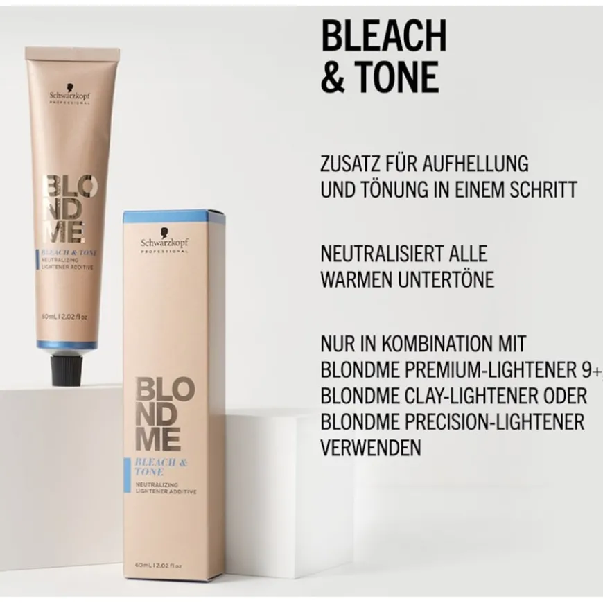 Die Farbe ist in verschiedenen kühlen Nuancen erhältlich, so dass Ihr Wunschblond ganz sicher dabei ist. Neben der einfachen Anwendung hat das Produkt weitere Vorteile. Die verbesserte Bonding-Technologie umhüllt die vorhandenen Metallionen im Haar und verhindert so die Bildung freier Radikale. Das bedeutet einen erhöhten Schutz für Ihr Haar während der Blondierung. Das Ergebnis ist ein kühles Blond ohne Gelbstich in der gewünschten Farbe bei maximaler Schonung der Haarstruktur.Fazit: Bleach & Tone von Schwarzkopf Professional ist die perfekte Lösung für alle, die ein natürliches Blond ohne Gelbstich wünschen. Das Produkt ist einfach anzuwenden, bietet einen hohen Schutz für das Haar und sorgt für ein strahlendes Ergebnis.
