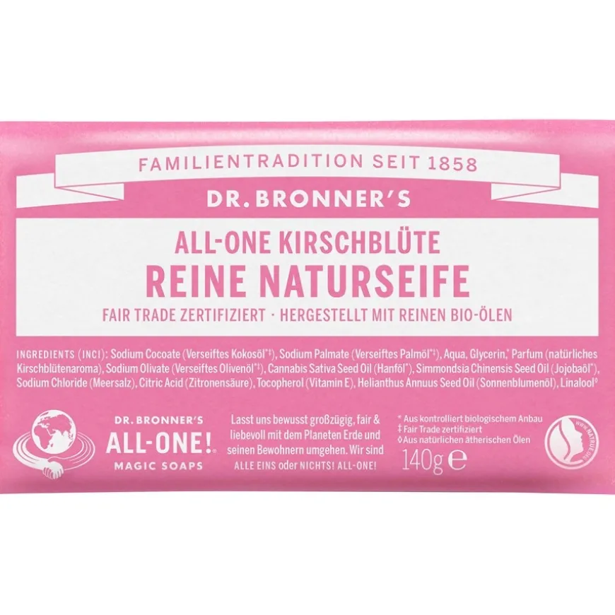 Schäumen Sie die All-One Kirschblüte Reine Naturseife von Dr. Bronner’s mit wenig Wasser auf und verteilen Sie sie gleichmäßig und sanft auf der Haut. Anschließend gut abspülen. Während das Kokosnussöl für einen leichten, seidigen Schaum sorgt, verhindert wertvolles Jojobaöl, dass Ihre Haut bei der regelmäßigen Körperhygiene austrocknet – eine Hautpflege, die nicht nur ein blitzsauberes Gefühl hinterlässt, sondern auch einen tollen Verwöhn-Effekt für Körper und Sinne hat! Dr. Bronner’s All-One Kirschblüte Reine Naturseife ist Fair Trade zertifiziert. Das Seifenstück hat ein Gewicht von 140 Gramm und eignet sich auch gut als kleine Aufmerksamkeit oder nettes Mitbringsel.