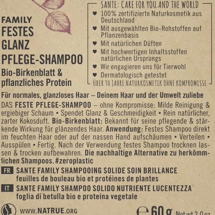 Festes Glanz Pflege-Shampoo Bio-Birkensaft von Sante Naturkosmetik schenkt den Haaren reichhaltige Pflege und reinigt sie schonend. Es kräftigt die Haare und umspielt sie mit seinem köstlichen Duft. Dank seiner festen Formel ist es so ergiebig, dass es zwei Flaschen herkömmliches Shampoo ersetzt. Es passt in jede Tasche und ist die ideale Wahl für unterwegs. Seine umweltfreundliche Formel eignet sich für normales und glanzloses Haar. Sie ist frei von Silikonen und Plastik. Schäumen Sie das Shampoo auf der nassen Hand auf und verteilen Sie es gleichmäßig in den Haaren. Spülen Sie es sorgfältig aus und erleben Sie gesundes, glänzendes Haar!