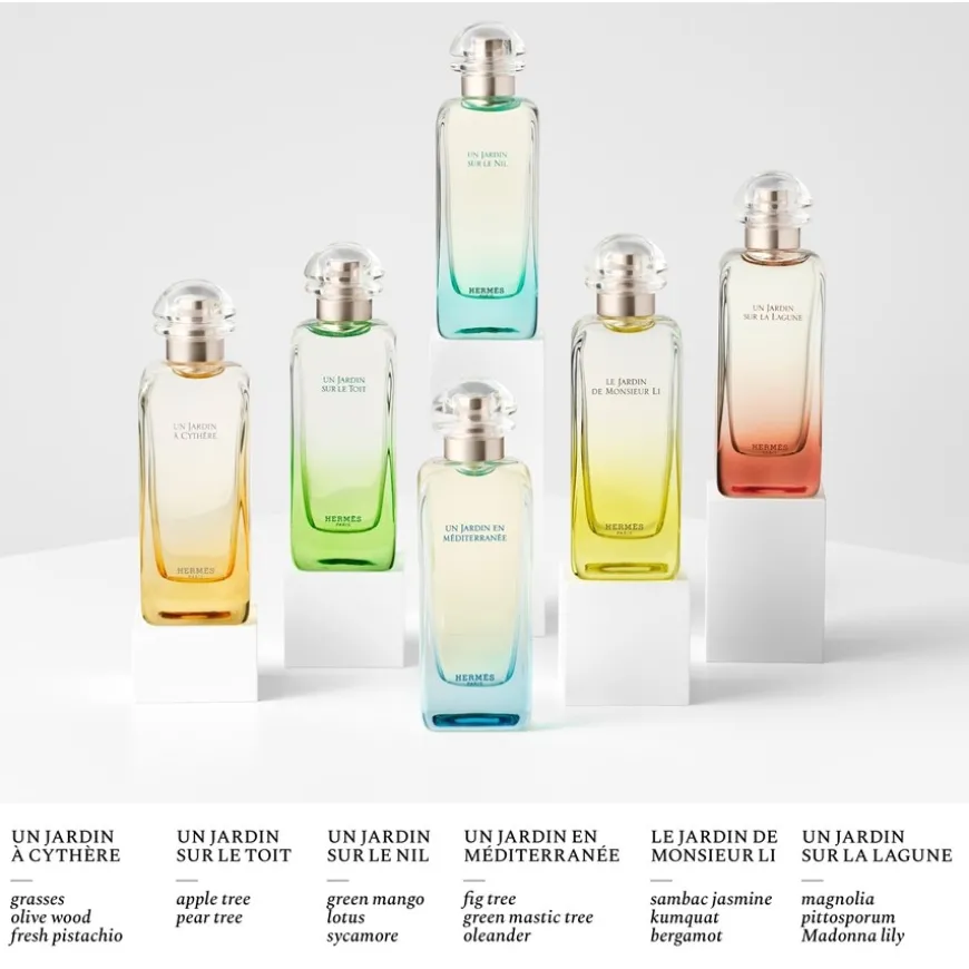 Die Kollektion Parfums-Jardins steht für die Begegnung zwischen der Seele eines Ortes, der Inspiration des Parfumeurs und dem Thema, das Hermès jedes Jahr für seine Kreationen auswählt. Es ist ein olfaktorischer Spaziergang, der alle Wünsche und Begehren erfüllt: die Sehnsucht nach Frische, nach Träumerei und Alltagsflucht.