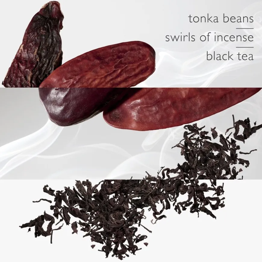 Bei diesem geheimnisvollen Duft mit Holznoten unterstreicht die Tiefe von Schwarztee die sinnliche Tonkabohne und den umhüllenden Weihrauch.
