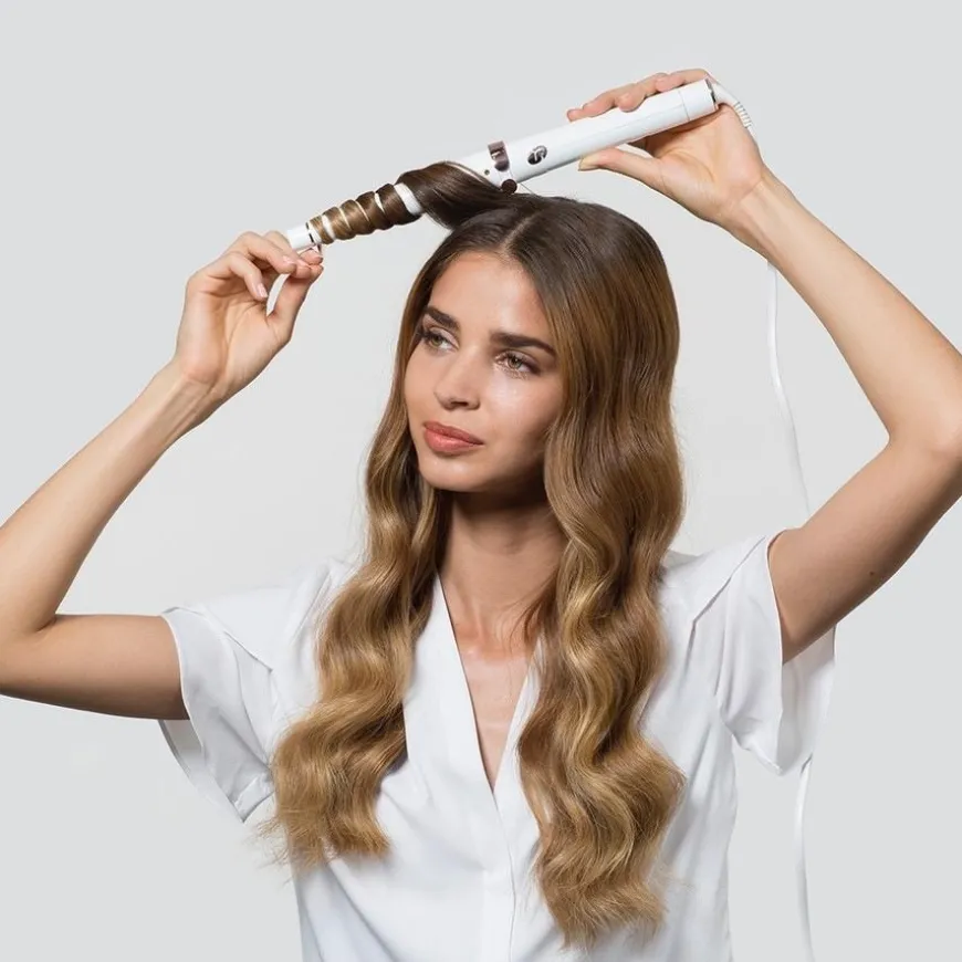 Klemme die Strähne an der Spitze ein und drehe sie auf den Lockenstab. Halte die Locke rund 10 bis 20 Sekunden in dieser Position.