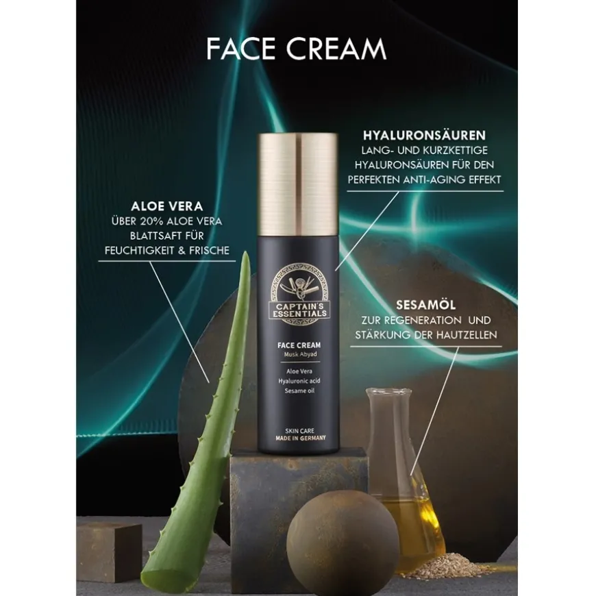 Dafür werden bei der Captain’s Essentials Musk Abyad Face Cream Premium Hautpflege über 20 % Aloe-Vera-Blattsaft als auch lang- und kurzkettige Hyaluronsäuren für den Anti-Aging-Effekt eingesetzt. Außerdem findet hochwertiges Sesamöl für eine nachhaltige Regeneration und Stärkung der Hautzellen seinen Einsatz. Die innovative Formulierung der Hautpflege bietet einen hervorragenden Schutz Ihrer Haut als kühlende und lang anhaltend beruhigende Face Cream. Darüber hinaus wirkt das enthaltene Panthenol der Cream entzündungshemmend und zusätzlich regenerierend. Die Q10-Anti-Aging-Formel mit arktischen Beeren und natürlichem Mentholderivat schenkt Ihrer Männerhaut den täglichen Frische-Kick! Natürlicher Zuckertang wirkt zellaktivierend und ebenfalls feuchtigkeitsspendend. Lassen Sie sich und Ihr Umfeld mit dem herrlich männlichen Musk-Abyad-Duft dieser Creme verwöhnen.