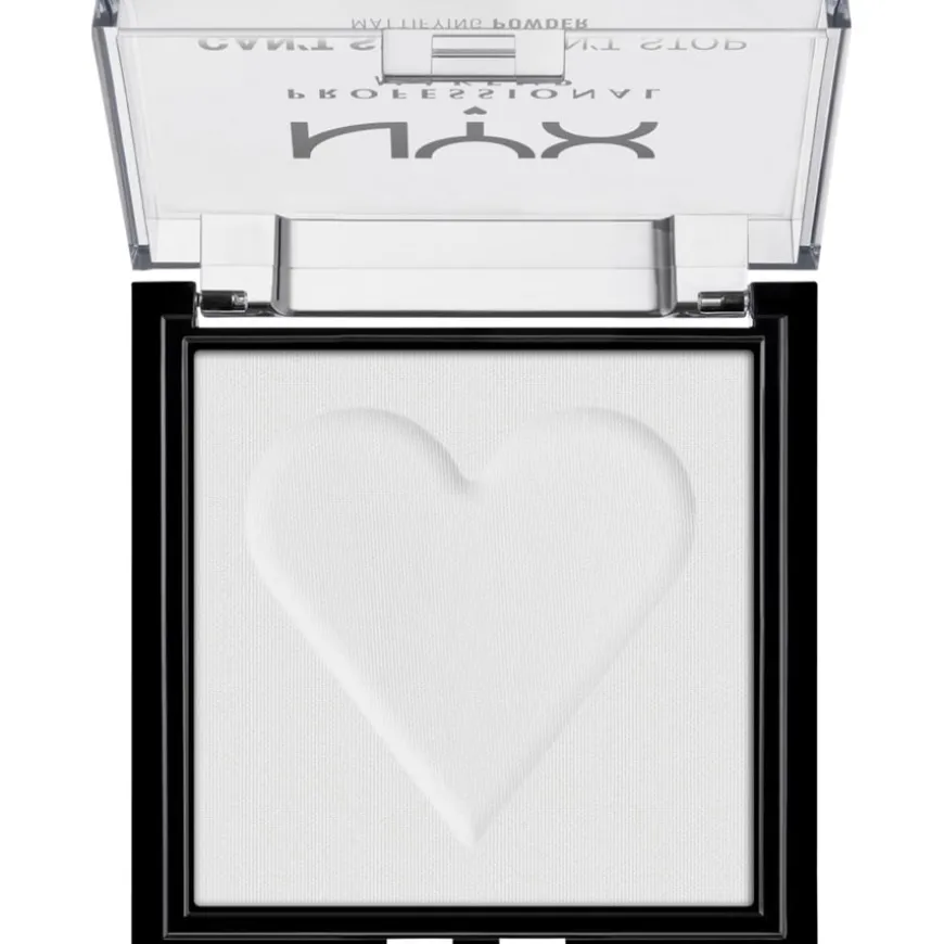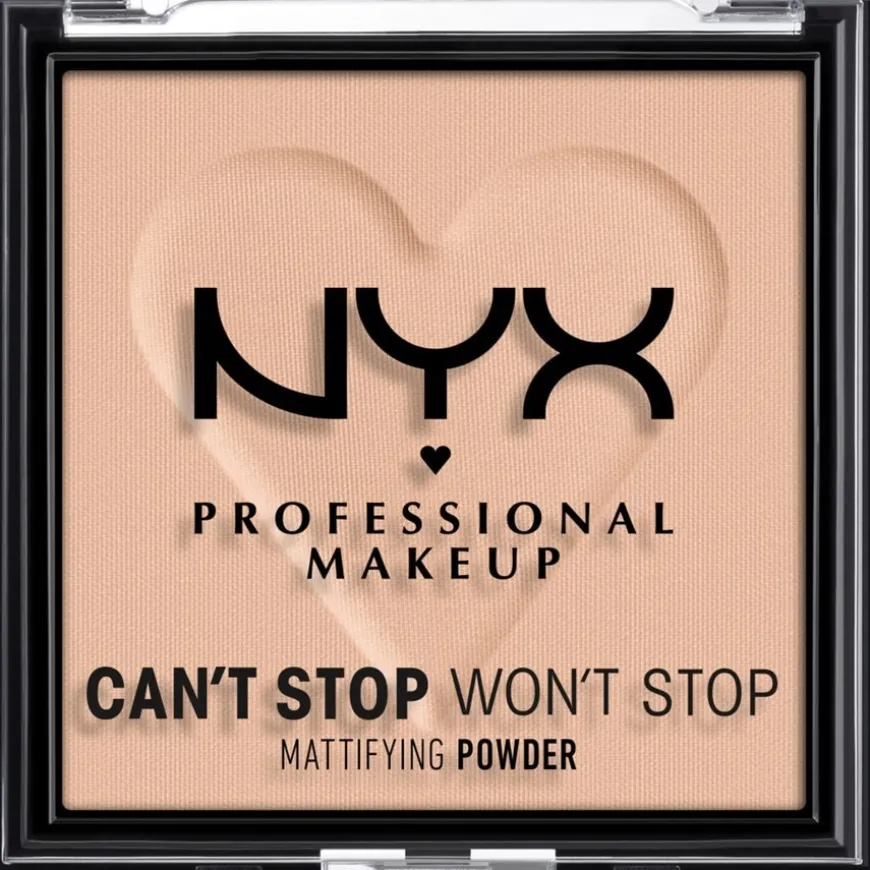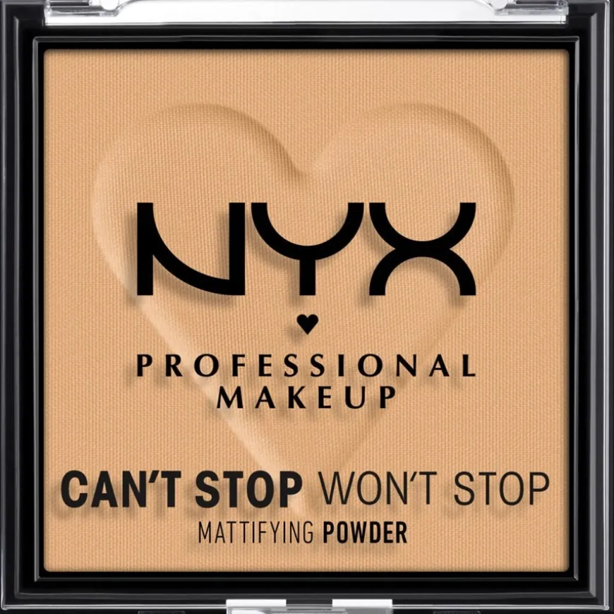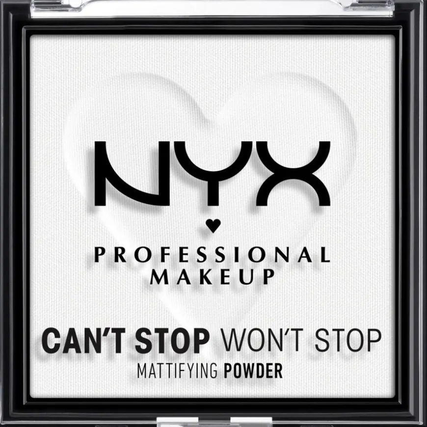. Das gepresste Puder enthält einen hohen Anteil an ölabsorbierender Reisstärke, die Hautglanz verhindert und für ein natürliches Aussehen sorgt.Das Can’t Stop Won’t Stop Mattifying Powder zeichnet sich durch seine hohe Haltbarkeit auf der Haut aus, fühlt sich dabei aber federleicht und angenehm an. Es setzt sich für ein glattes, natürliches Hautbild weder in Fältchen noch in Poren ab und kaschiert durch seine leichte Deckkraft kleine Unreinheiten und Rötungen. Dank der guten Haftung gibt es mit diesem Make-up-Produkt von NYX Professional Makeup kein Verschmieren oder Abfärben – das Can’t Stop Won’t Stop Mattifying Powder bleibt an der Stelle, auf die es aufgetragen wurde.Die feinen Farbpigmente beleben fahle Haut und verleihen ihr ein gesundes, ausgeruhtes Erscheinungsbild. Das Puder trocknet die Haut trotz seiner mattierenden Wirkung nicht aus. Es kann unter oder über dem Make-up mit einem Schwämmchen oder einem Pinsel aufgetragen werden und verleiht jeder Foundation ein mattes Finish.