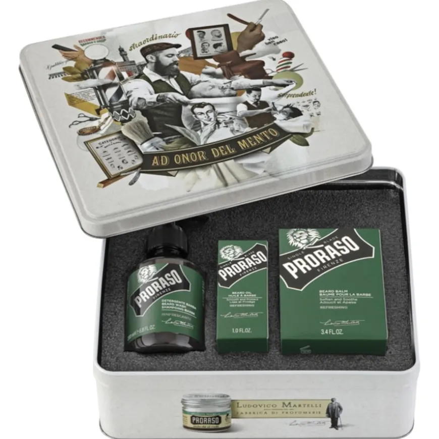 Die grüne Linie von Proraso ist die traditionelle Produktlinie. Sie wurde bereits in den 40er- Jahren des letzten Jahrhunderts entwickelt. Die Pflegeprodukte duften belebend nach Eukalyptus und Menthol. Mit diesem würzig-frischen Dufterlebnis hat Proraso den Grundstein für den Unternehmenserfolg gelegt. Das Bart-Shampoo der grünen Linie reinigt gründlich, ohne zu reizen oder Haut und Bart auszutrocknen. Es entfernt Schüppchen sowie Verschmutzungen und bereitet den Bart auf die weitere Pflege vor.Der Bartpflegebalsam im Refresh-Geschenkset eignet sich ausgezeichnet für die Pflege von wachsenden Bärten. Dank seiner sorgfältig zusammengestellten Formel unterstützt der Balsam einen gesunden Bartwuchs und mindert den Juckreiz. Das reichhaltige Bartöl pflegt nicht nur die Barthaare. Auch der Haut kommt eine regelmäßige Anwendung des Öls zugute. Vitamin E und wertvolle Pflanzenöle spenden Feuchtigkeit und verleihen dem Bart Glanz.