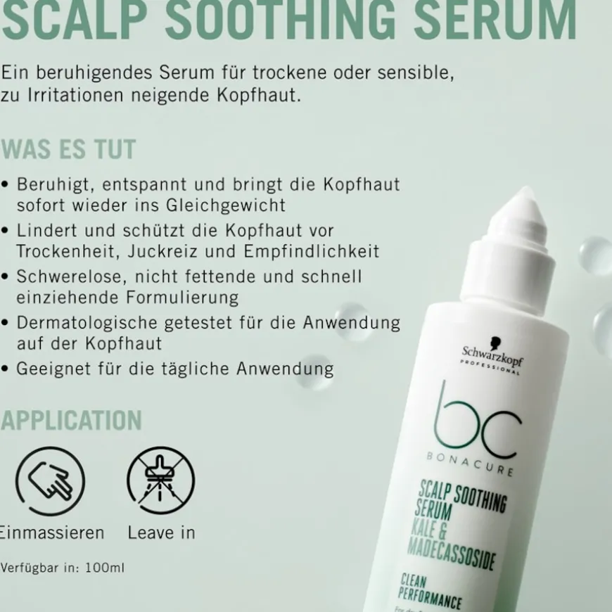 Nach der Haarwäsche tragen Sie das Scalp-Care-Serum scheitelweise auf die Kopfhaut auf. Anschließend massieren Sie es gleichmäßig in die Kopfhaut ein. Das Soothing Serum verbleibt bis zur nächsten Haarwäsche im Haar. Intensiveren können Sie die Wirkung der Haarpflege, indem Sie sie mit weiteren Produkten aus der Scalp-Care-Serie von Schwarzkopf Professional kombinieren. Beachten Sie zudem, dass nur eine regelmäßige Anwendung des Serums zu bestmöglichen Ergebnissen führt.