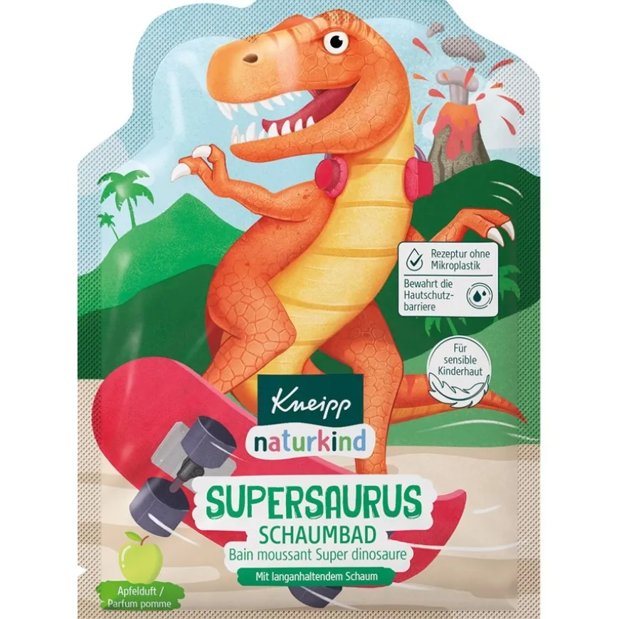 Das Naturkind Schaumbad Supersaurus bringt Hautpflege mit Unterhaltung für Kinder zusammen. Es gehört zur Produktlinie Schaum- & Cremebäder der Marke Kneipp. Die Marke ist international bekannt für Naturheilpflege und hat ihren Sitz in Würzburg. Die Rezeptur setzt sich aus hochwertigen Inhalten zusammen und nimmt Rücksicht auf die Bedürfnisse sensibler Kinderhaut.