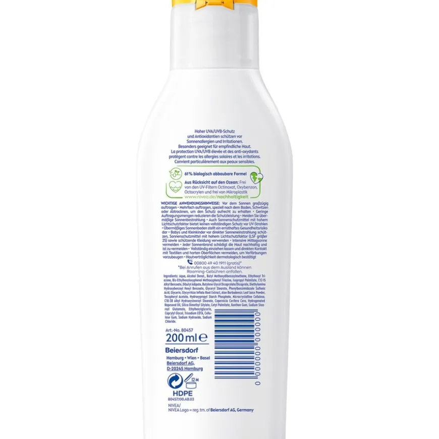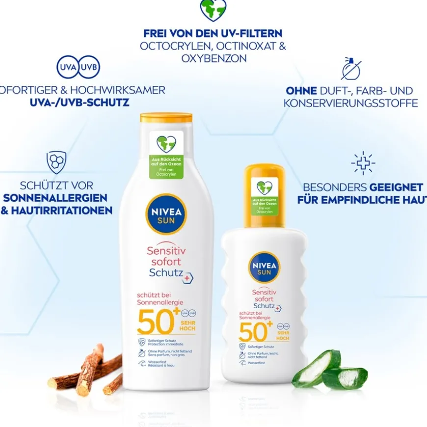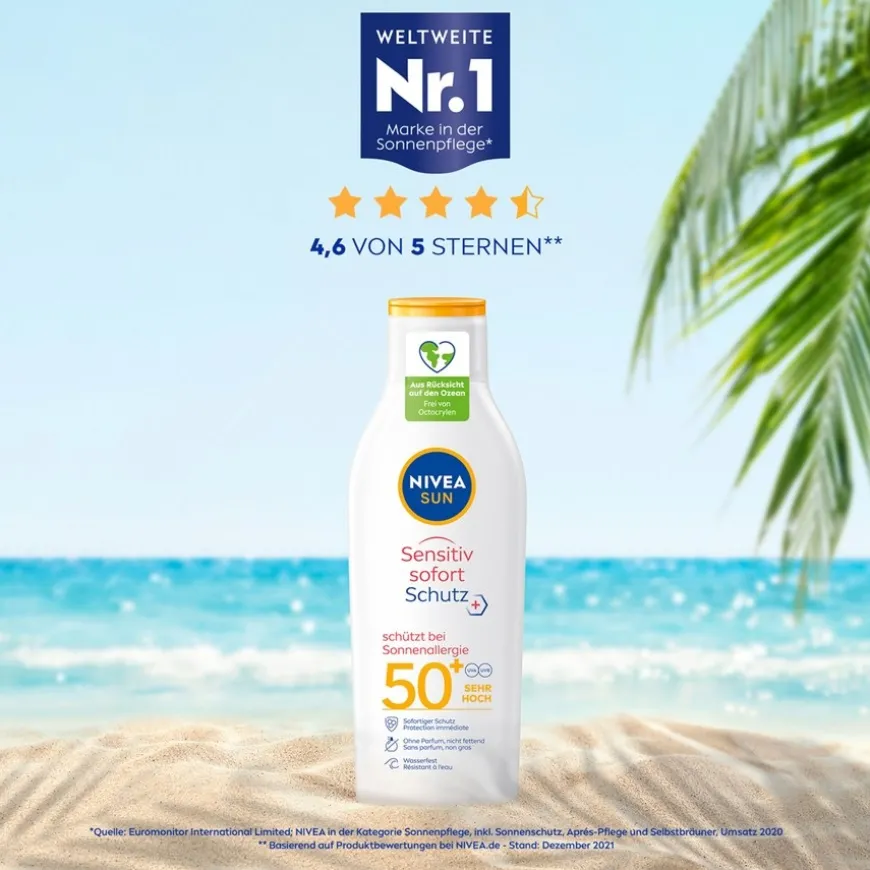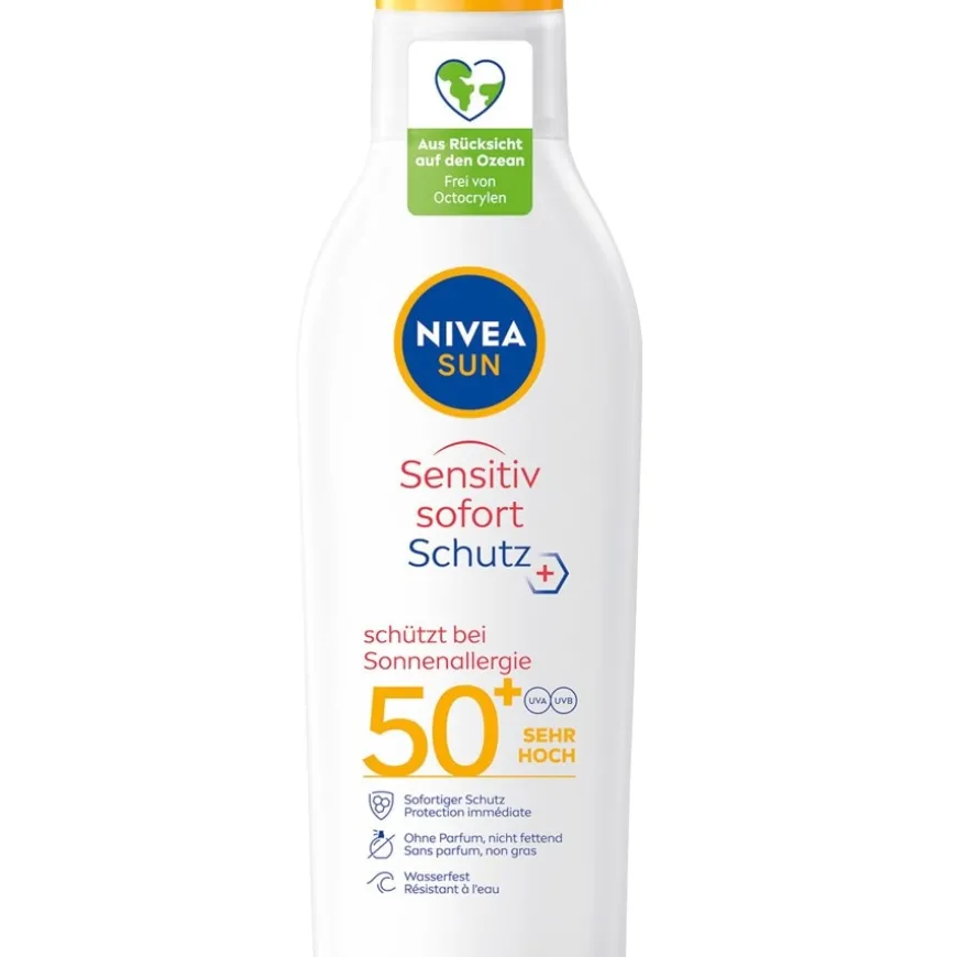 Die Sensitive Sofort-Schutz Sonnenlotion LSF 50+ Anti-Sonnenallergie von NIVEA schützt die Haut optimal vor Schäden durch UV-A- und UV-B-Strahlung, lichtbedingter Hautalterung und sonnenbedingten Irritationen. Gleichzeitig pflegt sie die sensible Haut sanft und durchfeuchtet sie. Sie ist frei von Parfum und den UV-Filtern Octinoxat und Oxybenzon, die Korallenriffe schädigen. Ihre Hautverträglichkeit ist dermatologisch getestet. Tragen Sie die Sonnenpflege vor dem Aufenthalt in der Sonne großzügig auf die Haut auf und wiederholen die Anwendung regelmäßig, vor allen nach dem Schwimmen. Genießen Sie geschmeidig weiche, sanft gebräunte Haut.