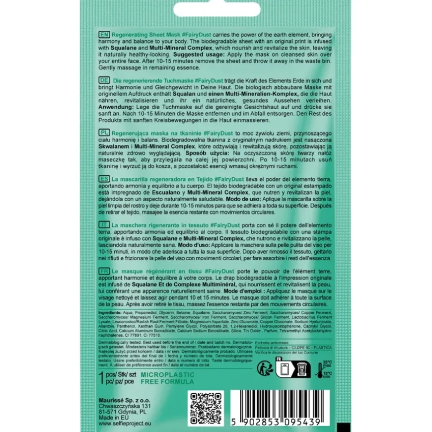 Die Selfie Project Fantasy Regenerating Sheet Mask #FairyDust spiegelt die Kraft des Elements Erde wider. Sie besteht aus einem weichen, biologisch abbaubaren Material, das sich angenehm auf der Haut anfühlt und sich zudem perfekt an die Gesichtskonturen anpasst. Die Wirkstoffe können dadurch noch besser in die Haut eindringen. Getränkt ist die Tuchmasken-Hautpflege in einem Serum mit Squalan und einem Multi-Mineralien-Komplex. Die Inhaltsstoffe nähren und revitalisieren die Haut und bringen sie wieder ins Gleichgewicht. Ihr Teint wirkt dadurch innerhalb weniger Minuten frischer und gesünder. Die Tuchmaske ist jedoch nicht nur durch ihre Wirkung ein Hit, mit dem originellen Druck macht die Beautybehandlung zudem jede Menge Spaß.