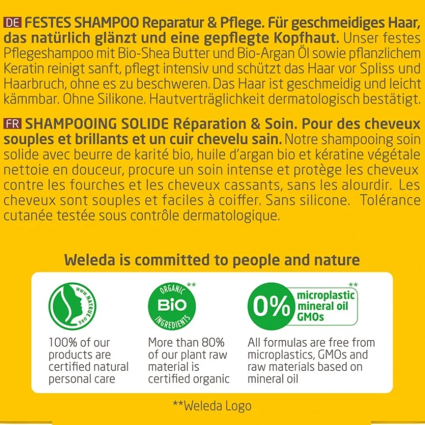 Festes Shampoo Reparatur & Pflege enthält Sheabutter und Arganöl in Bioqualität. Bei Sheabutter handelt es sich um ein halbfestes Pflanzenfett, das besonders hautfreundlich ist und einen hydratisierenden Effekt auf Haut und Haare hat. Arganöl ist ein leichtes Öl, das schnell einzieht und die Barrierefunktion der Kopfhaut nachhaltig stärkt. Zusätzlich ist Keratin enthalten – eine Substanz, die in der Lage ist, geschädigtes Haar zu reparieren und der Entstehung von neuem Spliss zuverlässig vorzubeugen. Die Haarpflege reinigt Ihr Haar intensiv und verbessert zudem die Kämmbarkeit. Trotz ihrer intensiv pflegenden Eigenschaften beschwert sie das Haar nicht, sondern verleiht ihm ein hohes Maß an Leichtigkeit und Frische. Nicht zuletzt begeistert das feste Shampoo von Weleda durch einen fruchtigen Duft nach Cassis, Davana und Sandelholz.