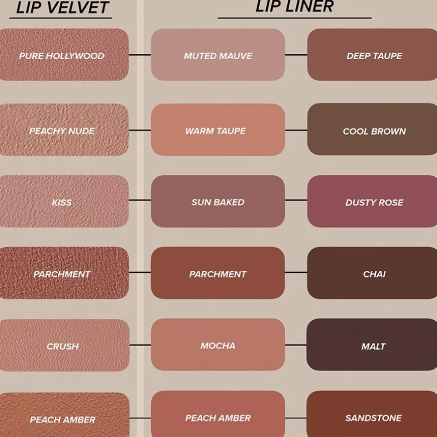 | Colour | Blackberry, Cool Brown, Crush, Hush Rose, Kiss, Pale Mauve, Parchment, Peach Amber |