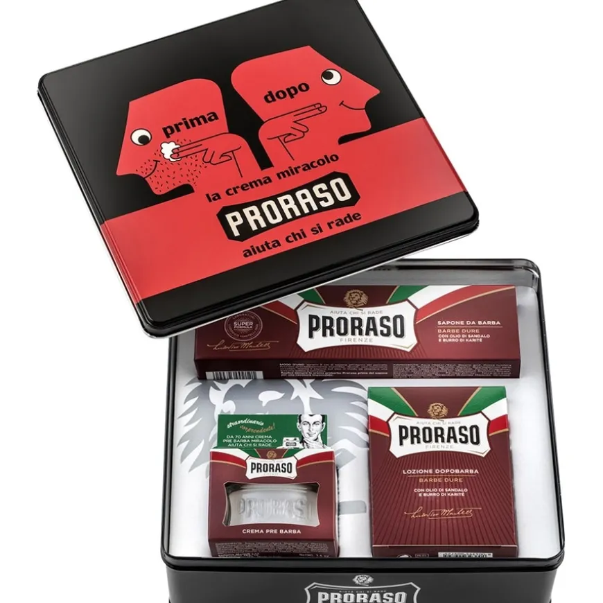 Eine sorgfältige Rasur besteht aus vorbereitender Pflege, dem Rasieren selbst und einer abschließenden Pflege. Für jede der drei Phasen bietet das Geschenkset ein passendes Pflegeprodukt. Alle stammen aus der Roten Linie von Proraso, die sich durch ihre reichhaltige Pflegformel auszeichnet. Die Pre-Shave Creme enthält Sheabutter und Sandelholzöl. Sie versorgen die Haut mit Nährstoffen und Feuchtigkeit. Dadurch wird sie gut auf die Rasur vorbereitet und neigt seltener zu Irritationen.Die Nourish-Rasiercreme verwöhnt trockene und empfindliche Haut. Dank der hochwertigen Inhaltsstoffe gleitet der Rasierer glatter über die Haut. Selbst stärkere Barthaare lassen sich problemlos rasieren. Nach der Rasur wirkt der Aftershave-Balsam beruhigend und entspannend. Er beugt unangenehmen Hautreizungen vor und hilft, die Poren zu schließen.