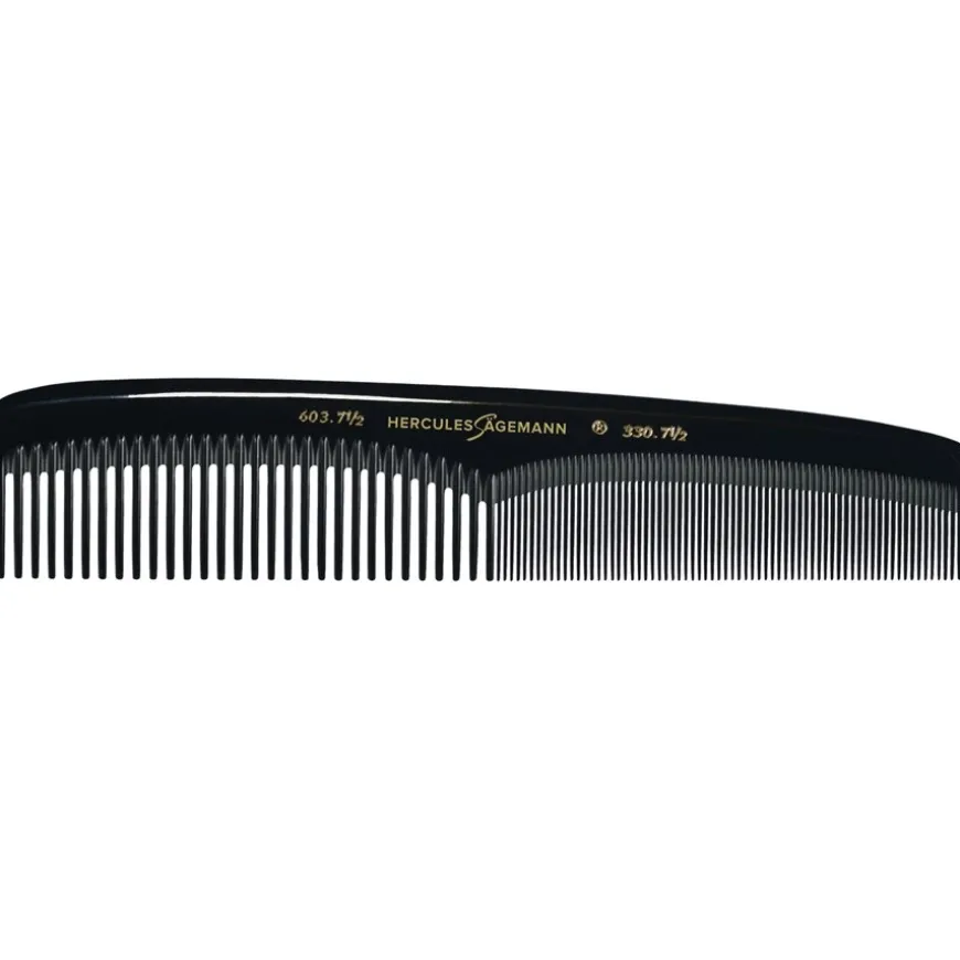 Der Damen-Reisekamm Modell 603-330 präsentiert sich in der eleganten Farbe Schwarz. Beeindruckend wirkt die Aufschrift in Blattgold. Dieser Kamm überzeugt außerdem durch hervorragende Produkteigenschaften. Dank seines schmalen Formates passt er in jede Hand- und Reisetasche. Auch in Ihrer Jackentasche findet dieser schicke Damenkamm seinen Platz. Die Reise- und Taschenkämme der Firma Hercules Sägemann bestehen überwiegend aus hochwertigem Ebonit und werden größtenteils in Handarbeit gefertigt. Kämme aus Ebonit zeichnen sich durch ihre ausgezeichnete Stabilität sowie durch hohe Hitze- und Säurebeständigkeit aus. Der Damen-Reisekamm Modell 603-330 besitzt weite und schmale Zinken. Damit eignet er sich zum Kämmen jeden Haares und für jeden Haarstil. Die abgerundeten Zinken schonen sowohl Ihre Haare als auch Ihre Kopfhaut. Führen Sie Ihre Reise- und Taschenkämme immer griffbereit mit sich und genießen Sie das wunderbare Gefühl, stets gepflegte Haare zu tragen.
