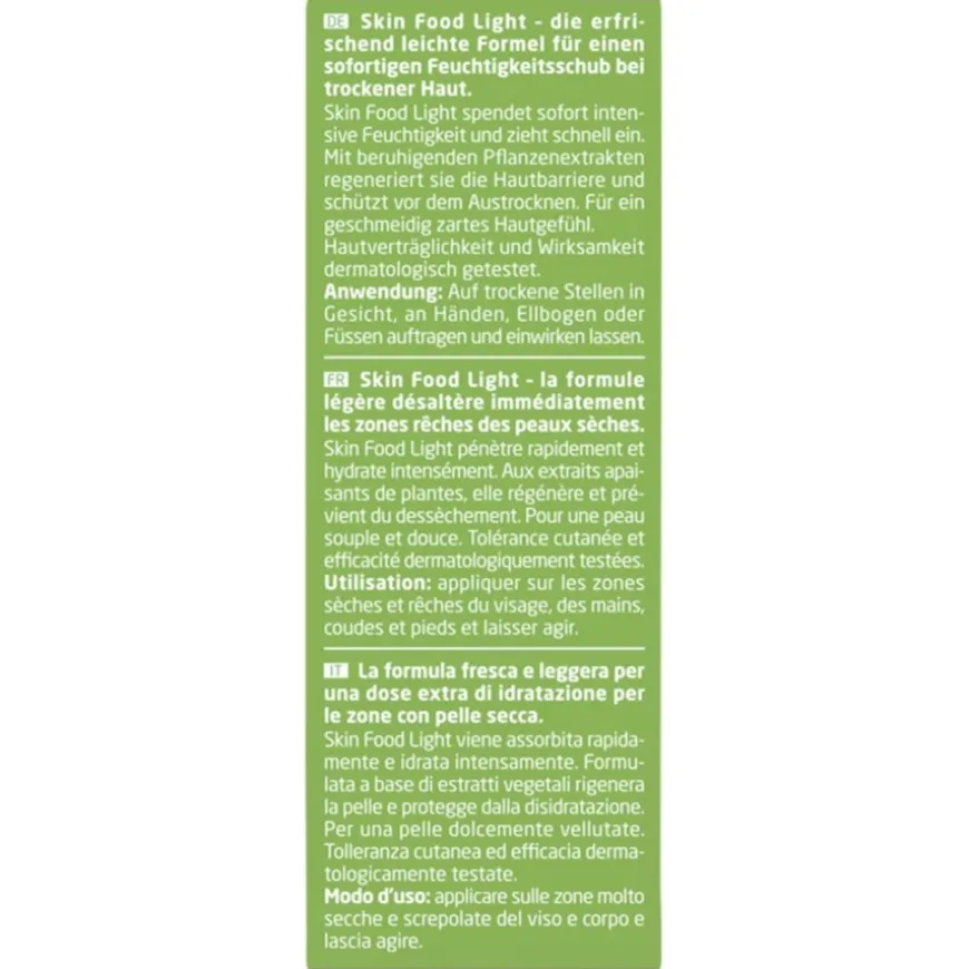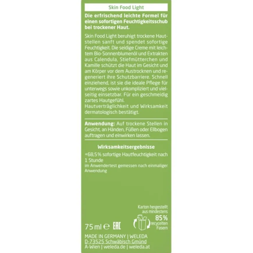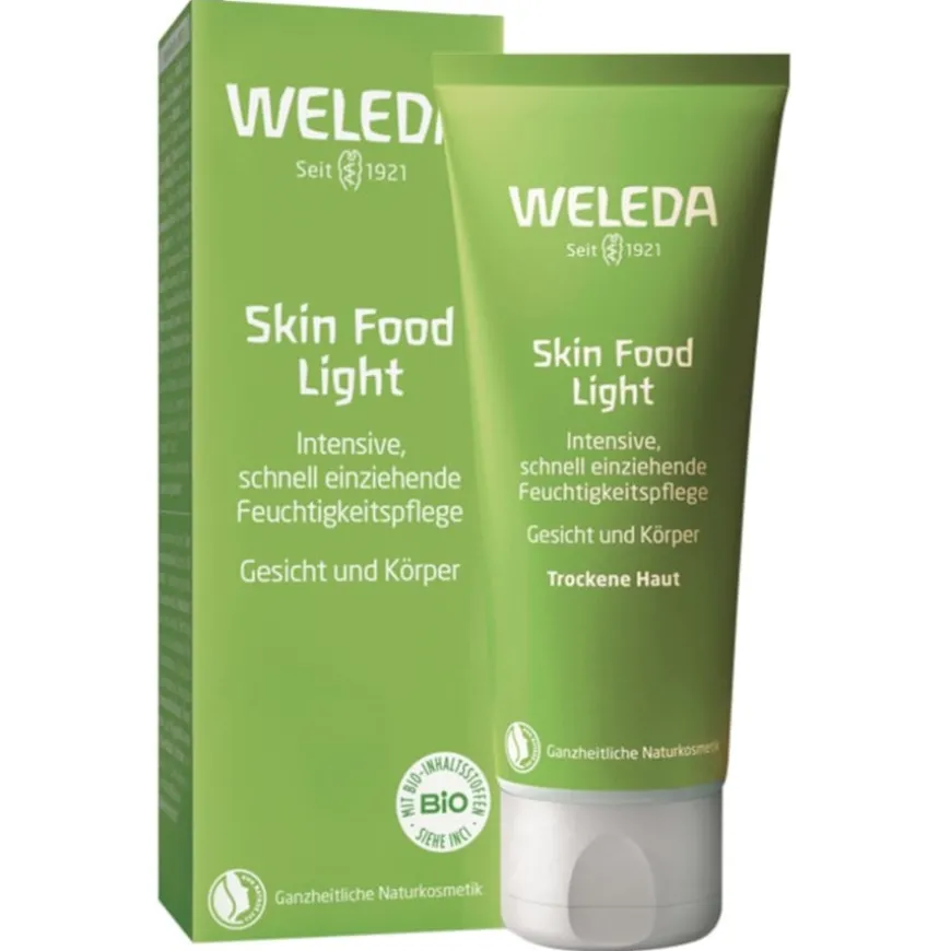 Die Weleda Skin Food Light Tagespflege ist eine Weiterentwicklung der beliebten Skin Food Creme aus dem Hause Weleda, die im Gegensatz zum Original noch leichter ist und somit schneller in die Haut einzieht – wodurch sie sich auch hervorragend als Begleiter im Urlaub oder auf längeren Ausflügen eignet. Sie versorgt trockene Haut sofort mit viel wertvoller Feuchtigkeit und eignet sich sowohl für eine Anwendung im Gesicht als auch auf allen anderen Regionen des Körpers. Die idealerweise nicht fettende Creme beinhaltet viele wertvolle Inhaltsstoffe aus der Natur, zu denen u.a. Bio-Sonnenblumenöl, Bio-Kakaobutter, Bio-Bienenwachs und Bio-Sheabutter gehören, die die Haut direkt nach der Anwendung angenehm weich und geschmeidig machen. Die Haut wird somit effektiv vor dem Austrocknen geschützt und kann sich fortan endlich von ihrer schönsten Seite zeigen. Zur Anwendung einfach auf die gewünschten Hautbereiche auftragen und mit kreisenden Bewegungen einmassieren.